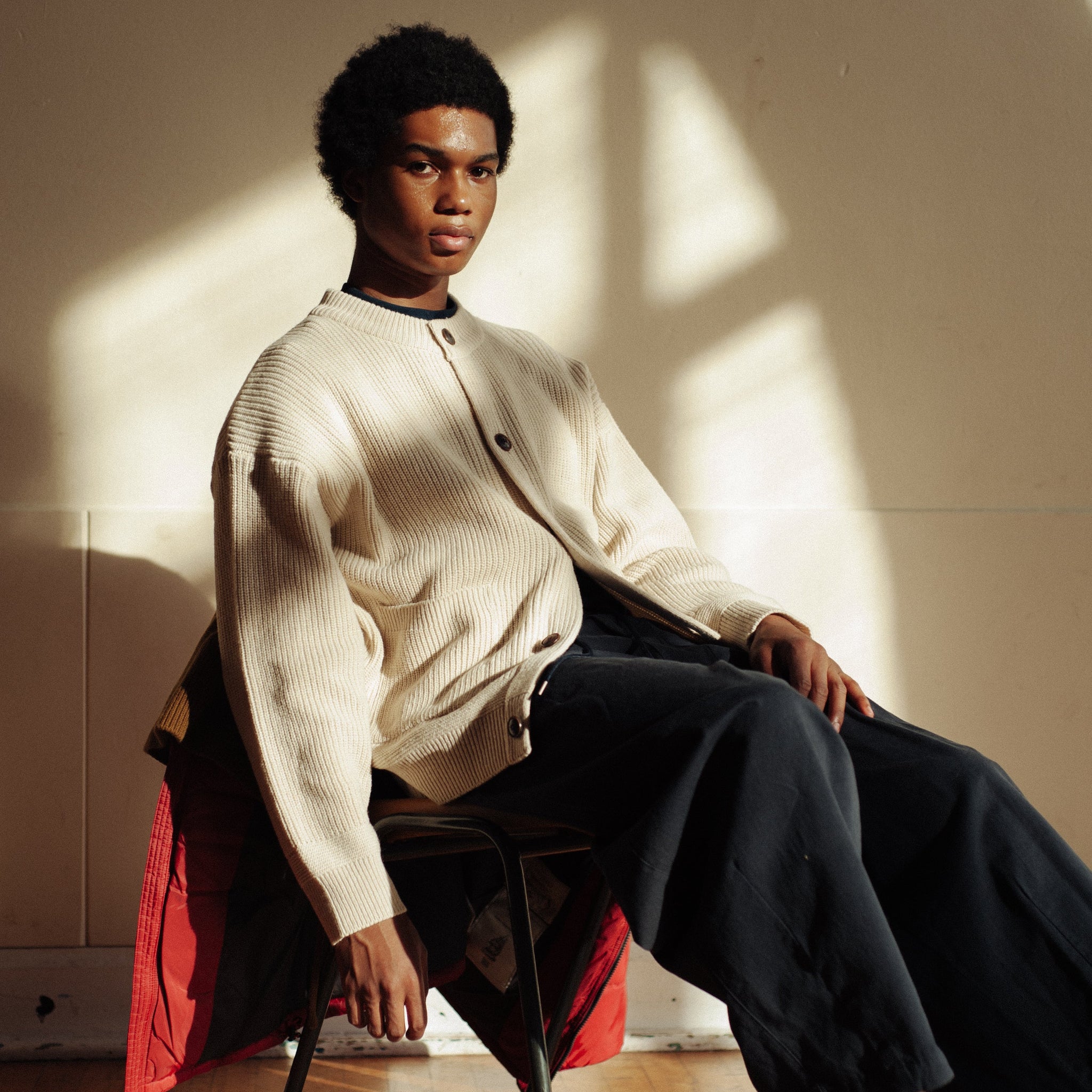 . Round neck full button cardigan, inspired by the workwear of the 50's and 60's from the streets of Korea.